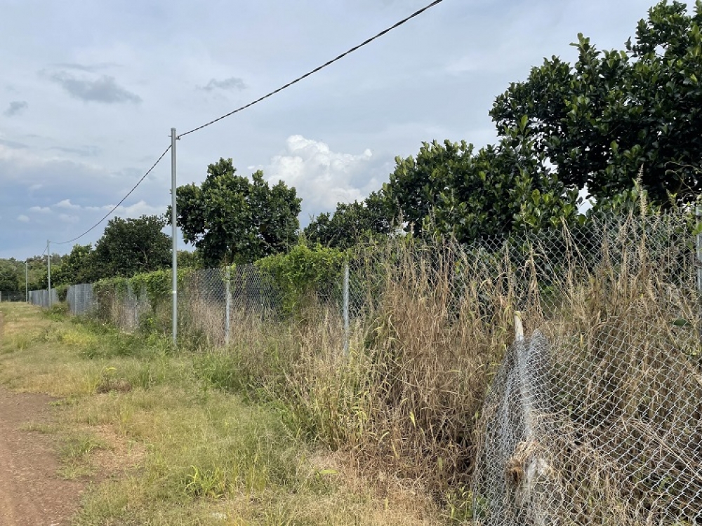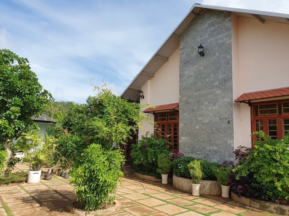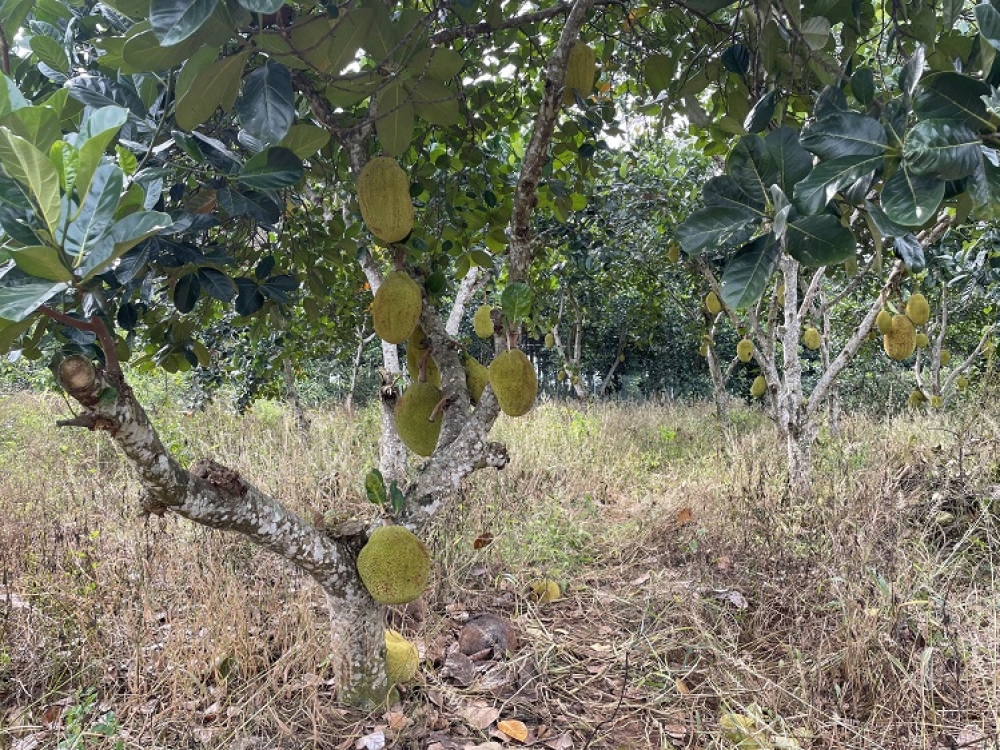 Trên đất có căn nhà biệt thự + xưởng, rộng 500m2. Đang trồng mít và sầu riêng.